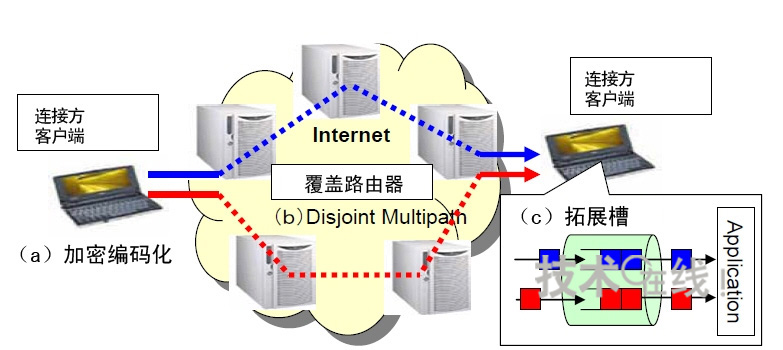 由于是利用多路徑路由發(fā)送分割的數(shù)據(jù),1條路徑被竊聽(tīng)只會(huì)有部分分割數(shù)據(jù)被竊聽(tīng)。不過(guò),如果發(fā)送分割數(shù)據(jù)的全部路徑都被竊聽(tīng),分割數(shù)據(jù)也可能全部流出。為此,此次的秘密通信系統(tǒng)設(shè)想采用基于覆蓋路由器的網(wǎng)絡(luò)(覆蓋網(wǎng)絡(luò)),將全部數(shù)據(jù)被竊聽(tīng)的可能性減小到了接近0。這是因?yàn)楦采w路由器的通信路徑能夠進(jìn)行實(shí)時(shí)切換。此次的保密通話系統(tǒng)將在覆蓋網(wǎng)絡(luò)達(dá)到實(shí)用化水平時(shí)投產(chǎn)實(shí)用。計(jì)劃在3~4年內(nèi)實(shí)現(xiàn)。