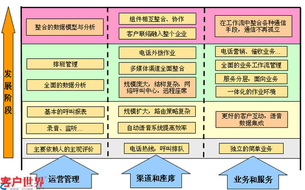 如圖一所示,國內(nèi)大多數(shù)企業(yè)呼叫中心基本經(jīng)歷了三個(gè)階段的發(fā)展,在呼叫中心建設(shè)初期,往往只是建設(shè)成電話熱線,座席人員接通電話,通過與客戶交流,利用簡單獨(dú)立的呼叫中心應(yīng)用系統(tǒng),完成咨詢和接受訂單工作,在這階段對呼叫中心來講基本沒有什么管理,主要靠人的主觀評價(jià)來實(shí)現(xiàn)粗放運(yùn)營。