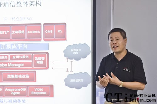 上圖為:Avaya中國(guó)區(qū)副總裁李農(nóng)講解Avaya Aura 聯(lián)絡(luò)中心6.2系統(tǒng)架件