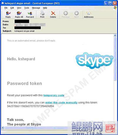不幸的是,Skype的弱點(diǎn)漏洞在過去也曾被發(fā)現(xiàn)利用,Skype的知名度也同樣地被利用來進(jìn)行垃圾訊息攻擊。下圖所示是目標(biāo)針對(duì)Skypeg使用者的垃圾訊息: