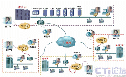 如上圖所示,由于Cisco IPCC是基于標(biāo)準(zhǔn)IP網(wǎng)絡(luò)的純IP呼叫中心解決方案,呼叫中心的核心設(shè)備都只部署在省中心機(jī)房,其它地市只需要在原有網(wǎng)絡(luò)的路由器上添加語(yǔ)音模塊即可實(shí)現(xiàn)PSTN語(yǔ)音的本地接入,而無需再各地市購(gòu)買額外的接入設(shè)備。而同樣由于IP網(wǎng)絡(luò)的特性,呼叫中心的坐席可以根據(jù)需要部署在甘肅省運(yùn)輸管理局IP網(wǎng)絡(luò)可達(dá)的任何一個(gè)地方,各地市的坐席只需要配備IP電話和座席PC即可。來自PSTN的電話根據(jù)用戶在IVR中的選擇和其它路由策略,自動(dòng)分配到最適合的坐席處理,譬如來自白銀的運(yùn)政投訴由白銀市本地的運(yùn)政大廳座席人員處理。