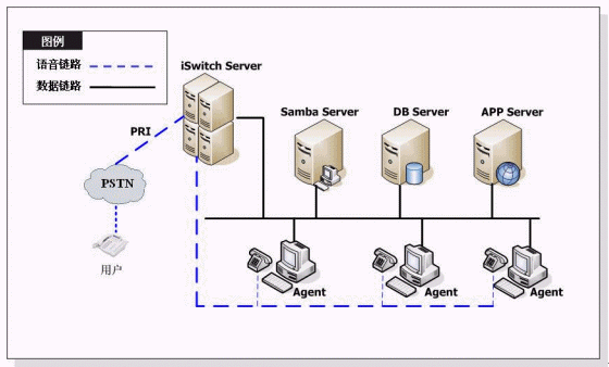 Samba Dialer®通過China ISDN PRI直接和PSTN連接,系統(tǒng)結構如下圖所示: