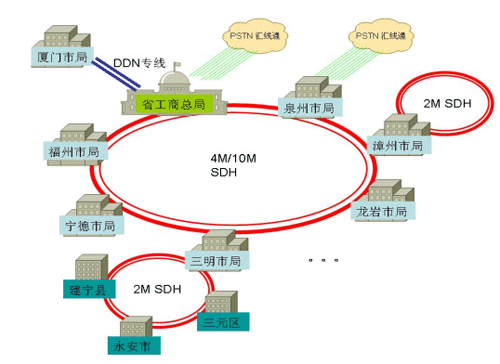SDH專線連接下轄各縣區(qū)局,組建成全省范圍的工商系統(tǒng)專網(wǎng)。