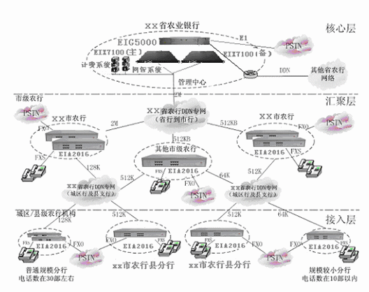 省行、各地市行與縣支行、分理處與數(shù)據(jù)業(yè)務(wù)共用專網(wǎng)線路,實(shí)現(xiàn)VOIP互連,形成一個(gè)全省范圍內(nèi)的VOIP大網(wǎng),實(shí)現(xiàn)全省內(nèi)部語音的免費(fèi)通信和內(nèi)部號(hào)碼的縮位拔號(hào),節(jié)省了各行間的市話費(fèi)用,節(jié)省大量長(zhǎng)途話費(fèi)。各節(jié)點(diǎn)按FXO:FXS