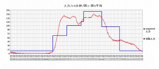 有時(shí)候也會(huì)畫一張一整個(gè)月的電話量和人力比較圖,一般是禮拜一和二的電話最多,也就是把每天的電話總量和上班的人力做個(gè)比較,畫出一條每天的曲線圖。