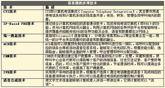 易客通將全套的語音、數(shù)據(jù)、互聯(lián)網(wǎng)服務(wù)和豐富的業(yè)務(wù)應(yīng)用整合到單個(gè)系統(tǒng)中(All-In-One),融合語音和數(shù)據(jù),以模塊化的形式提供各種功能(CRM、IVR、多媒體功能、錄音、報(bào)表、管理工具、客戶化產(chǎn)品定制開發(fā)工具、自動(dòng)外撥系統(tǒng)等),滿足不同用戶的需求,系統(tǒng)開放、可靠、易于擴(kuò)展和升級(jí),容易獲得和使用,一切都非常簡單,可以從容應(yīng)對(duì)e時(shí)代企業(yè)通信系統(tǒng)所面臨的諸多復(fù)雜挑戰(zhàn)。