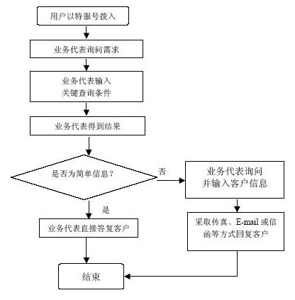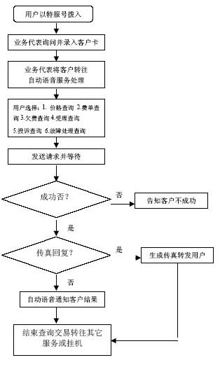 系統(tǒng)自動(dòng)報(bào)受理人員工號(hào),人工交互式受理方式。受理人員根據(jù)用戶要求從服務(wù)質(zhì)量標(biāo)準(zhǔn)數(shù)據(jù)庫(kù)、電費(fèi)數(shù)據(jù)庫(kù)和其他相連的數(shù)據(jù)庫(kù)查詢資料,然后通過(guò)語(yǔ)音方式播報(bào)資料或送到用戶指定的傳真機(jī)或其他終端設(shè)備上。主要內(nèi)容如下: