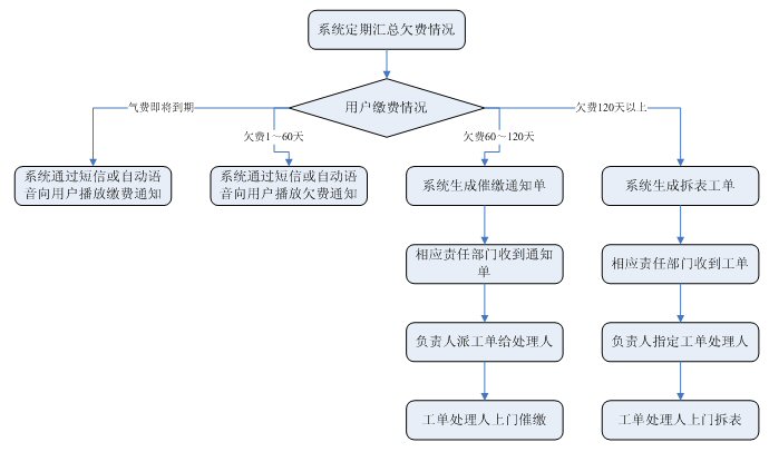 業(yè)務(wù)咨詢:用戶通過人工、自動語音等方式咨詢有關(guān)政策法規(guī)、資費(fèi)標(biāo)準(zhǔn)、用氣常識、報裝方法等,系統(tǒng)以語音、傳真、Email、短消息等方式回復(fù)客戶。