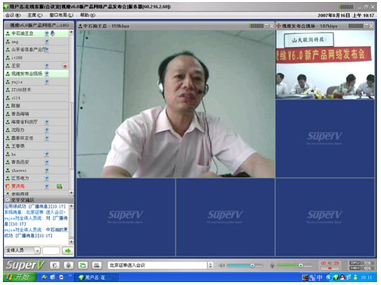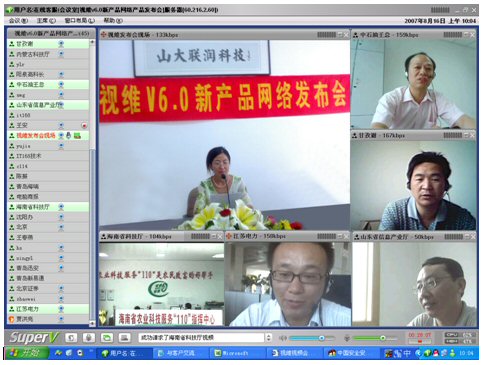 2007年8月16日,視維視頻會(huì)議V6.0新產(chǎn)品網(wǎng)絡(luò)發(fā)布會(huì)在美麗的泉城濟(jì)南舉行,山東省信息產(chǎn)業(yè)廳、濟(jì)南市信息產(chǎn)業(yè)局的領(lǐng)導(dǎo)、山東省電信等上級(jí)主管部門領(lǐng)導(dǎo),視維產(chǎn)品新老用戶和有視頻會(huì)議需求的潛在客戶,國內(nèi)外合作伙伴,IT168、中國計(jì)算機(jī)報(bào)、電腦商報(bào)、C114、支點(diǎn)網(wǎng)、計(jì)算機(jī)世界、CTI論壇、投影時(shí)代等國內(nèi)知名媒體100多人參加了這次網(wǎng)絡(luò)發(fā)布會(huì)。在此次會(huì)議上,山大聯(lián)潤公司通過視頻會(huì)議與各地與會(huì)者進(jìn)行了良好的溝通,同時(shí)這次發(fā)布會(huì)開創(chuàng)了用視頻會(huì)議發(fā)布新產(chǎn)品的先河。
