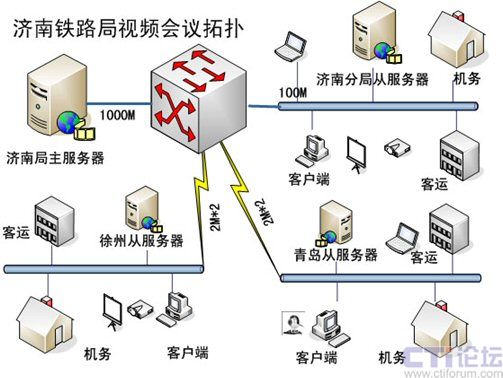 由于路局改革后組織結(jié)構(gòu)的特點(diǎn),決定了跨地域會(huì)議較多,如濟(jì)南和徐州、青島之間召開(kāi)的部門級(jí)別的會(huì)議比較頻繁,加上三地之間的帶寬制約,本方案建議采用主從服務(wù)器的系統(tǒng)架構(gòu),1主3從,主服務(wù)器設(shè)置在路局網(wǎng)絡(luò)中心,原來(lái)濟(jì)南分局位置設(shè)置1臺(tái)從服務(wù)器,負(fù)責(zé)濟(jì)南地區(qū)的內(nèi)部會(huì)議,以及與其他2地的遠(yuǎn)程會(huì)議,同樣徐州、青島也各設(shè)置1臺(tái)從服務(wù)器。