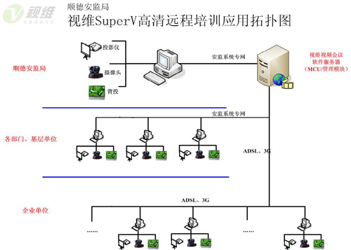 順德安監(jiān)局各部門(mén)及下屬單位使用安監(jiān)系統(tǒng)專網(wǎng)進(jìn)行連接,而重點(diǎn)培育企業(yè)網(wǎng)絡(luò)情況復(fù)雜,涉及ADSL以及3G無(wú)線網(wǎng)絡(luò)等多種情況,視維根據(jù)順德安監(jiān)局、局下屬單位及重點(diǎn)培育企業(yè)的分布情況,將服務(wù)器架設(shè)在順德安監(jiān)局總部,并在總部搭建會(huì)議室和培訓(xùn)中心,其他各部門(mén)、下屬單位和重點(diǎn)培育企業(yè)為分會(huì)場(chǎng)。