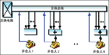 系統(tǒng)集中提供一組或多組電話會議資源,然后利用交換總線將所有需要參加某個會議的話路交換至特定的電話會議資源,從而實(shí)現(xiàn)會議應(yīng)用。如圖1所示。