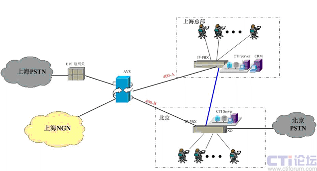 在上海采用傲威通信的AVS軟交換平臺(tái)實(shí)現(xiàn)VoIP呼叫系統(tǒng)的主叫識(shí)別,決定呼叫路由的選定。在上海和北京分別建設(shè)IP-PBX和CTI呼叫系統(tǒng),在各辦事處或分公司可根據(jù)選擇是否要建設(shè)坐席或普通電話系統(tǒng),所有節(jié)點(diǎn)的呼入呼出統(tǒng)一從上海出口實(shí)現(xiàn)出入。