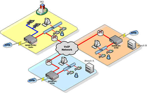 各地之間通過H.323 IP Trunk將彼此連接在一起。G700媒體網(wǎng)關(guān)提供了強大的VoIP DSP,一個媒體網(wǎng)關(guān)在不增加VoIP資源卡 (MM760)的情況下,以同時支持64路G.711壓縮標準的語音通信。