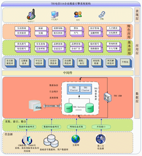 TRS公司結合電信行業(yè)114業(yè)務應用需求,依托自身企業(yè)搜索引擎產(chǎn)品和中文信息處理技術,推出的的電信114企業(yè)搜索引擎解決方案,能夠全面整合索引搜索電信114業(yè)務應用的信息內(nèi)容,并向用戶提供高效的、準確的、安全的、個性化的搜索體驗。其框架圖如下: