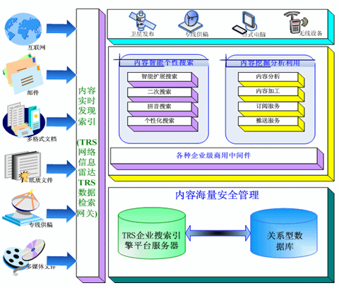 TRS公司推出的企業(yè)搜索引擎解決方案,利用TRS公司多年來自主開發(fā)的TRS Database Server作為企業(yè)搜索引擎服務的平臺。可以將電信企業(yè)內(nèi)外部多種格式、多種介質形態(tài)、多種存儲方式的內(nèi)容信息,以實時的方式將這些信息進行索引。并且在索引的過程中力求能夠做到準確,并配合以相關智能語言技術做信息的去重、自動標引等能力。其框架如圖: