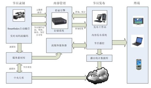 節(jié)目制作平臺(tái)主要負(fù)責(zé)節(jié)目的采編,接收節(jié)目源的數(shù)字視頻信號(hào)和模擬視頻信號(hào)進(jìn)行實(shí)時(shí)/超實(shí)時(shí)的轉(zhuǎn)碼,并同時(shí)進(jìn)行自動(dòng)編目、歸檔,滿足系統(tǒng)不同應(yīng)用的要求。另外,各資源建設(shè)成員單位或各地、州、市遠(yuǎn)程辦按照省遠(yuǎn)程辦的統(tǒng)一部署,加工各自類別的課件,采用人工傳送介質(zhì)或利用VPN實(shí)現(xiàn)專網(wǎng)的方式送交到資源庫(kù)系統(tǒng)中,實(shí)施統(tǒng)一的存儲(chǔ)和管理。