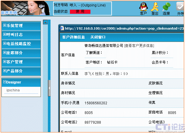 當客戶來電轉(zhuǎn)接人工服務(wù)時,自動彈出信息登記窗口并根據(jù)來電號碼檢查客戶資料庫中是否有該客戶的數(shù)據(jù)。如客戶的名稱、地址、聯(lián)系電話、身體狀況、膚色、以往的咨詢、投訴等記錄信息。以及來電日期、時間、受理人等;使座席人員一目了然,第一時間了解來電的相關(guān)信息。