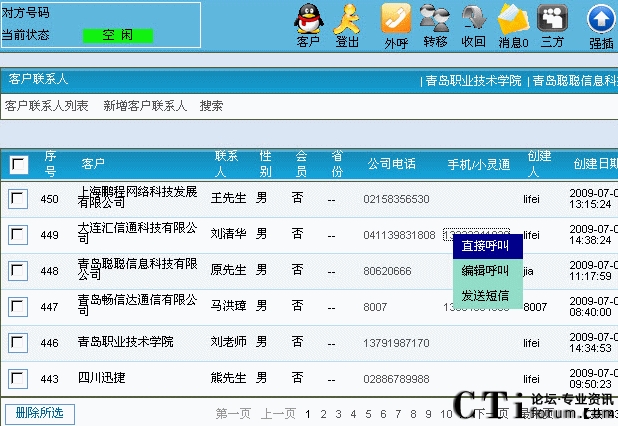 9. 外呼功能:座席人員可以選擇并點(diǎn)擊已有的聯(lián)系人、客戶(hù)的電話(huà)號(hào)碼,系統(tǒng)便自動(dòng)外呼并接通座席電話(huà),座席人員也可以手工輸入對(duì)方號(hào)碼,點(diǎn)擊外呼。