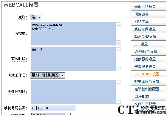 MVB2000系統(tǒng)中可以對(duì)WEBCALL的各種參數(shù)進(jìn)行設(shè)置,如下圖所示: