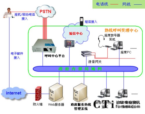 - 公民座機(jī)和移動(dòng)電話通過(guò)當(dāng)?shù)仉娦诺腜STN網(wǎng)絡(luò)接入呼叫中心平臺(tái),然后進(jìn)入熱線系統(tǒng);