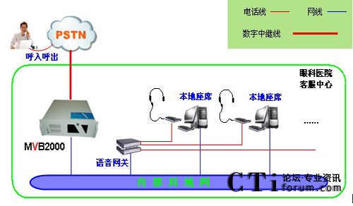 醫(yī)院采用暢信達(dá)通信MVB2000系統(tǒng)作為交換平臺(tái),采用1路E1數(shù)字中繼線接入,對外公布統(tǒng)一的外線呼入號(hào)碼,采用語音網(wǎng)關(guān)結(jié)合話機(jī)作為座席終端,前期投入8位人工座席,系統(tǒng)架構(gòu)形式如下:
