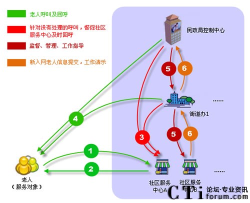 社區(qū)呼叫平臺(tái)包含:老人、民政局、街道辦、社區(qū)服務(wù)中心四個(gè)業(yè)務(wù)角色,民政局、街道辦、社區(qū)服務(wù)中心通過專用網(wǎng)絡(luò)建立高效聯(lián)動(dòng)機(jī)制。