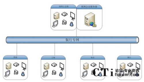如圖,大新銀行視頻會議系統(tǒng)應用規(guī)模為5個點,包括香港、深圳、上海、南京、鎮(zhèn)江,服務器部署在深圳用來保證香港和內地的鏈接效果,服務器出口帶寬為5M共享,各分會場通過專網(wǎng)訪問服務器。在這個網(wǎng)絡平臺上,紅杉樹網(wǎng)絡視頻會議所提供的高質量音視頻圖像、方便易用的文檔、文件共享數(shù)據(jù)功能,使得大新銀行能夠在這個平臺上進行從桌面討論到會議室正式會議等各種規(guī)模的應用。在這個平臺上,除了進行日常例會、業(yè)務交流等常見的應用之外,業(yè)務培訓、異地招聘等也是經(jīng)常進行的內容。業(yè)務人員利用數(shù)據(jù)功能,把平常培訓很難懂的新銀行產(chǎn)品、費率等進行介紹,節(jié)約了以前培訓所花費的大量精力和時間,為新產(chǎn)品迅速占領市場掌握了主動。