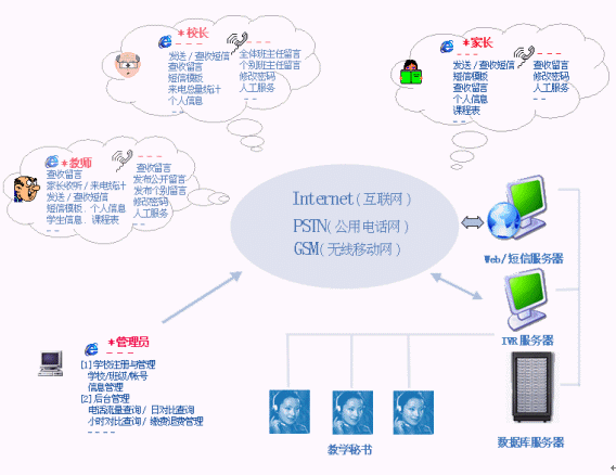 | 班主任留言(電話) | 通過電話直接給全體班主任或個(gè)別班主任留言,發(fā)布學(xué)校動(dòng)態(tài),班主任通知等。 |