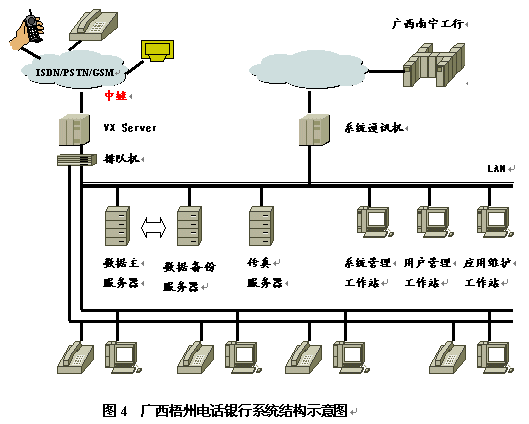 廣西工行推出的第一套銀行呼叫中心系統(tǒng)是在潤聲VX綜合信息系統(tǒng)開發(fā)平臺(UNIX版)上,在較短時間內(nèi)開發(fā)成功,首先在梧州分行開通運(yùn)行,獲得用戶的一致好評,并希望與潤聲公司進(jìn)一步合作。該系統(tǒng)的結(jié)構(gòu)如圖4所示。