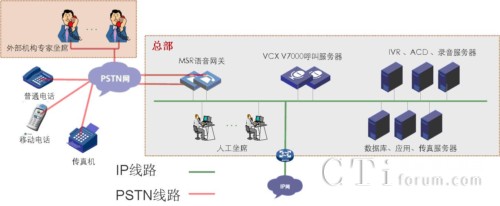 設(shè)備介紹:H3C VCX V7005完成呼叫處理;結(jié)合網(wǎng)音中間件軟件完成自動語音應(yīng)答、人工智能排隊(duì)、錄音、話務(wù)統(tǒng)計(jì)輸出等功能;MSR語音網(wǎng)關(guān)完成PSTN落地功能。