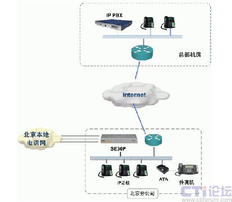 如上圖所示,通過SE30P的內置FXO接口,可以實現(xiàn)與北京PSTN網絡的互聯(lián),解決北京分公司與中國用戶的通信;通過SE30P的IP中繼方式,實現(xiàn)與總部的IP PBX互聯(lián),變國際長途為內部通話,為公司節(jié)省了大量辦公費用;公司內部使用IP話機作為人工總機和分機,并通過ATA實現(xiàn)傳真接入。