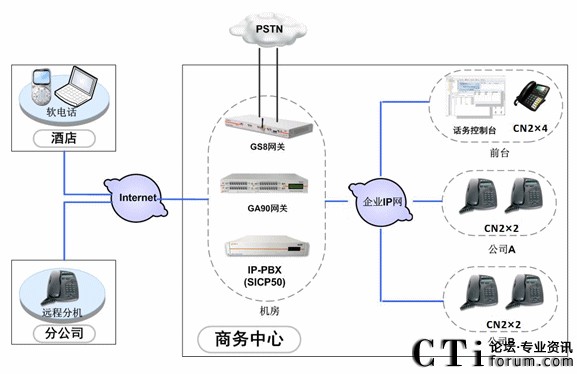 中天凱旋利用企業(yè)內(nèi)部完善的IP通信網(wǎng)絡,在機房部署SICP系統(tǒng),負責整個語音通信系統(tǒng)的服務管理、用戶管理。部署GA90網(wǎng)關(guān)和GS8網(wǎng)關(guān),分別使用E1中繼線路和普通模擬線路接入PSTN網(wǎng)絡,保證系統(tǒng)的通信。