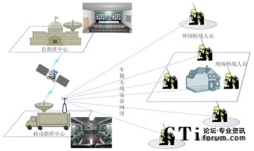 移動指揮中心可在執(zhí)行任務的時候開往作戰(zhàn)現(xiàn)場附近,車上部署一整套車載調(diào)度平臺,作為現(xiàn)場指揮人員進行調(diào)度指揮使用,同時在指揮車上部署無線寬帶網(wǎng)絡,作為戰(zhàn)場使用,移動指揮車和總指揮中心可通過衛(wèi)星網(wǎng)絡實現(xiàn)互聯(lián)互通。