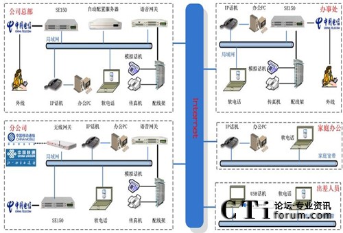 - 分布式部署:總部和各分支機(jī)構(gòu)的分機(jī),是通過IP網(wǎng)絡(luò)融合在一個(gè)語音平臺(tái)上來實(shí)現(xiàn)內(nèi)部通信?偛亢娃k事處分機(jī)、家庭辦公分機(jī)、出差人員的軟電話均注冊(cè)在總部的SE150上,各分公司的分機(jī)注冊(cè)在本地的SE150上,由本地的SE150管理。