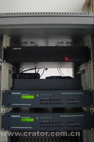 AV作為整個控制系統(tǒng)的核心;使用CREATOR快捷的VGA0808、AV0808矩陣切換器進(jìn)行音/視頻信號的相互切換;采用CREATOR配備的周邊設(shè)備對會議廳的電力環(huán)境進(jìn)行智能操控。