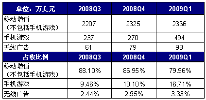 2009年第1季度,空中網(wǎng)手機(jī)游戲服務(wù)營(yíng)收為494萬美元,同比增長(zhǎng)304%,環(huán)比增長(zhǎng)83%;其中手機(jī)網(wǎng)游的營(yíng)收為72萬美元,同比增長(zhǎng)379%,環(huán)比增長(zhǎng)11%,單機(jī)游戲和WAP頁面游戲的服務(wù)營(yíng)收為422萬美元,同比增長(zhǎng)293%,環(huán)比增長(zhǎng)106%。手機(jī)游戲業(yè)務(wù)在空中網(wǎng)銷售收入中所占比重由2008年第4季度的10.10%上漲至16.71%。