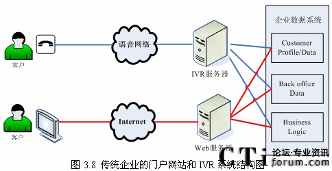 隨著Internet和Web技術(shù)的迅速發(fā)展,越來的企業(yè)開始建立自己的門戶網(wǎng)站,同時(shí)又擁有自己的IVR系統(tǒng)(如圖3.8所示),但是兩套系統(tǒng)完全獨(dú)立,語音系統(tǒng)和數(shù)據(jù)系統(tǒng)沒有任何交互或者只有很少的交互。而建立IVR系統(tǒng)的目標(biāo)就是給客戶更好的體驗(yàn),使客戶能方便的通過電話完成更多以前需要登陸企業(yè)門戶網(wǎng)站,或者親自去企業(yè)或其網(wǎng)點(diǎn)去辦理的業(yè)務(wù),這就需要IVR系統(tǒng)能跟后臺(tái)數(shù)據(jù)系統(tǒng)有更多更好的交互!罢Z音門戶”的概念出現(xiàn)也愈發(fā)的證明這一點(diǎn)。