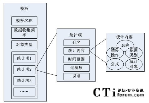由模板結構框架圖得知,模板包括模板名稱,數據統(tǒng)計對象,收集數據的頻率和多個基本統(tǒng)計項。其中,每個統(tǒng)計項對應著統(tǒng)計對象(如:坐席,路由點等)的一條統(tǒng)計內容信息(如:1小時內的呼叫總量等)。然后由這些統(tǒng)計項和統(tǒng)計參數組合成模板,從而構成對呼叫中心對象的統(tǒng)計信息。