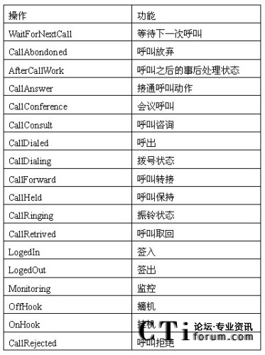 在呼叫中心服務器發(fā)送事件時,它都會對事件的對象指定的一個狀態(tài)。在任何時間,ODS源數據庫中,每個對象都被指定成一個唯一的狀態(tài)。這些狀態(tài)都來自話務對象的操作。
