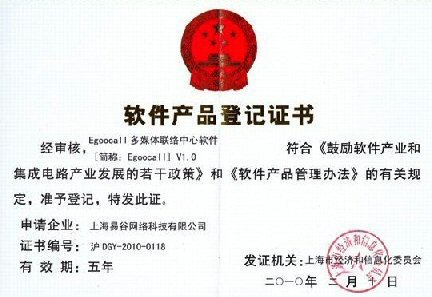 CTI論壇(ctiforum)3月8日消息(記者 袁青): 由易谷網(wǎng)絡自行研發(fā)的“Egoocall多媒體聯(lián)絡中心軟件”,于2010年2月10日通過上海市經(jīng)濟和信息化委員會審核,獲頒“軟件產(chǎn)品登記證書”。(證書號:滬DGY-2010-0118)