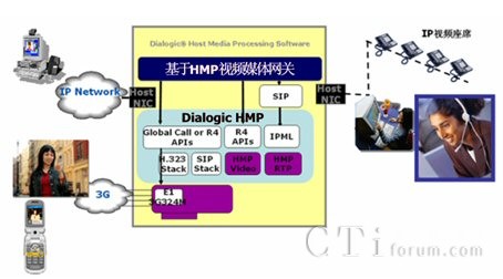 基于Dialogic HMP(Host Media processing)主機(jī)媒體處理技術(shù)的視頻呼叫中心主要通過網(wǎng)絡(luò)接口卡(“瘦卡”,Digital Network Interface卡)與PSTN(3G)相連。這里的PSTN包括電信、聯(lián)通和移動(dòng)等電信運(yùn)營(yíng)商。也可以通過H.323、SIP協(xié)議棧直接接受來自數(shù)據(jù)網(wǎng)絡(luò)的多媒體呼叫。