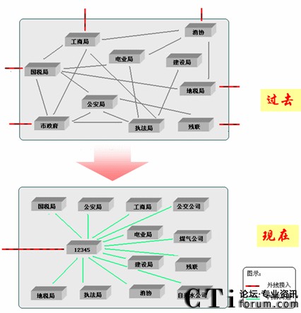 “12345” 政府熱線系統(tǒng)建設(shè)的最終目標(biāo),將要整合現(xiàn)有的全部政府部門公開電話資源,將所有的此類電話統(tǒng)一為一個(gè)號(hào),使政府公開電話服務(wù)范圍覆蓋到政府公共服務(wù)的全部領(lǐng)域。通過12345電話網(wǎng)絡(luò)將各級(jí)機(jī)構(gòu)服務(wù)電話資源進(jìn)行互聯(lián)(市區(qū)縣政府、公安非應(yīng)急電話、社保局、民政局、建設(shè)局、規(guī)劃局、國稅局、地稅局、教育局、衛(wèi)生局、文體局、旅游局、交通局、房產(chǎn)局等),這樣市民就不用再被這些部門上百個(gè)不同的電話號(hào)碼弄得無所適從,也不會(huì)因?yàn)榕磺宄虑闅w哪個(gè)部門管了。