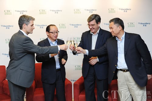 從左到右為:Marc Faucher(黑莓合作伙伴基金合伙人),田溯寧先生(CBC寬帶資本創(chuàng)始人),謝國睿先生(RIM中國區(qū)總裁),許志明先生(CBC寬帶資本投資團隊成員)