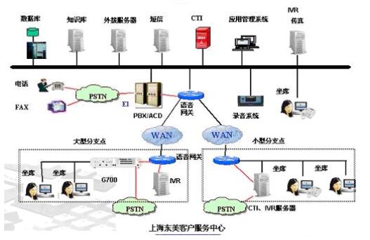 中心點(diǎn)和分支點(diǎn)的客服系統(tǒng)通過(guò)兩地的語(yǔ)音網(wǎng)關(guān)進(jìn)行語(yǔ)音連接,具體實(shí)現(xiàn)大概是,如果分支點(diǎn)需要把語(yǔ)音轉(zhuǎn)接到中心點(diǎn),分支點(diǎn)把TDM語(yǔ)音轉(zhuǎn)接到語(yǔ)音網(wǎng)關(guān),語(yǔ)音網(wǎng)關(guān)把TDM語(yǔ)音信號(hào)轉(zhuǎn)變?yōu)镮P包,通過(guò)網(wǎng)絡(luò)發(fā)送到中心點(diǎn)的語(yǔ)音網(wǎng)關(guān)上,語(yǔ)音網(wǎng)關(guān)把IP包變?yōu)門(mén)DM語(yǔ)音信號(hào),在接入到交換機(jī)上,由中心點(diǎn)CTI按照指定的策略轉(zhuǎn)接到最終目標(biāo)上。