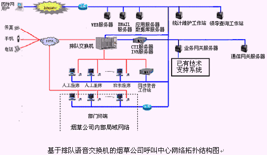 該煙草公司呼叫中心主要是由語(yǔ)音交換機(jī)、CTI服務(wù)器、IVR(交互式語(yǔ)音應(yīng)答)/IFR(交互式傳真應(yīng)答)子系統(tǒng)、人工座席子系統(tǒng)、應(yīng)用服務(wù)器、數(shù)據(jù)庫(kù)服務(wù)器、業(yè)務(wù)網(wǎng)關(guān)子系統(tǒng)、通信網(wǎng)關(guān)子系統(tǒng)等硬件設(shè)備和應(yīng)用軟件組成。