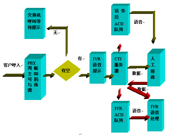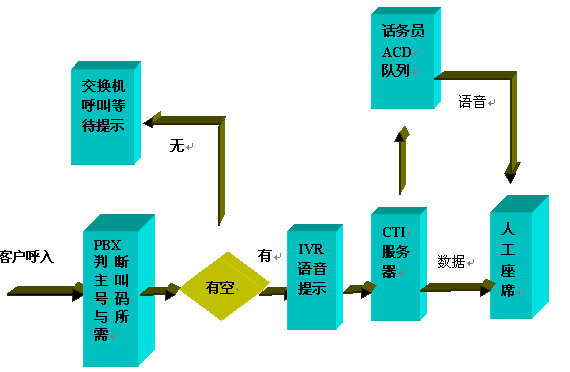 Server,CTI Server控制PBX執(zhí)行轉(zhuǎn)接任務(wù),呼叫進(jìn)入人工座席ACD隊(duì)列排隊(duì),如相關(guān)話務(wù)員有空閑,則執(zhí)行轉(zhuǎn)接操作。同時(shí)對(duì)于有些服務(wù),根據(jù)需要,CTI