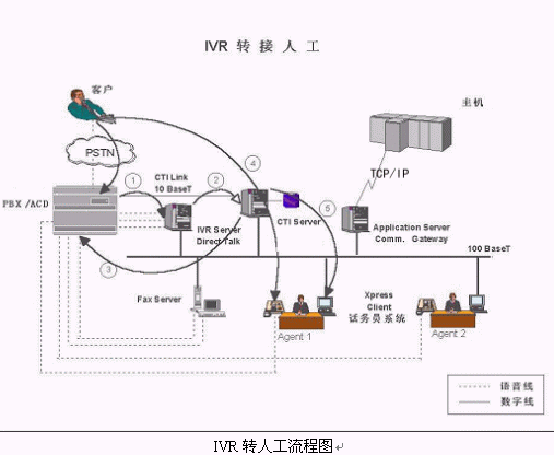 典型的客戶電話從人工服務(wù)轉(zhuǎn)接IVR的物理流程如下: