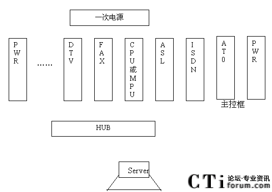 - CPU為256路主控板,對整個系統(tǒng)進行主控,為整個系統(tǒng)提供時鐘入同步信號及交換網,含一個10Base-T以太網口,通過HUB與Server進行控制信息的交互