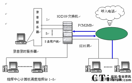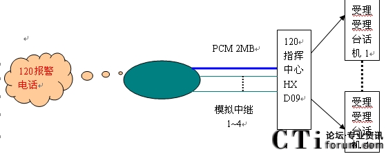 系統(tǒng)共包含4個E1,其中一個為公網呼入提供接口,另外三個可分別接入110、122(或120、119)。